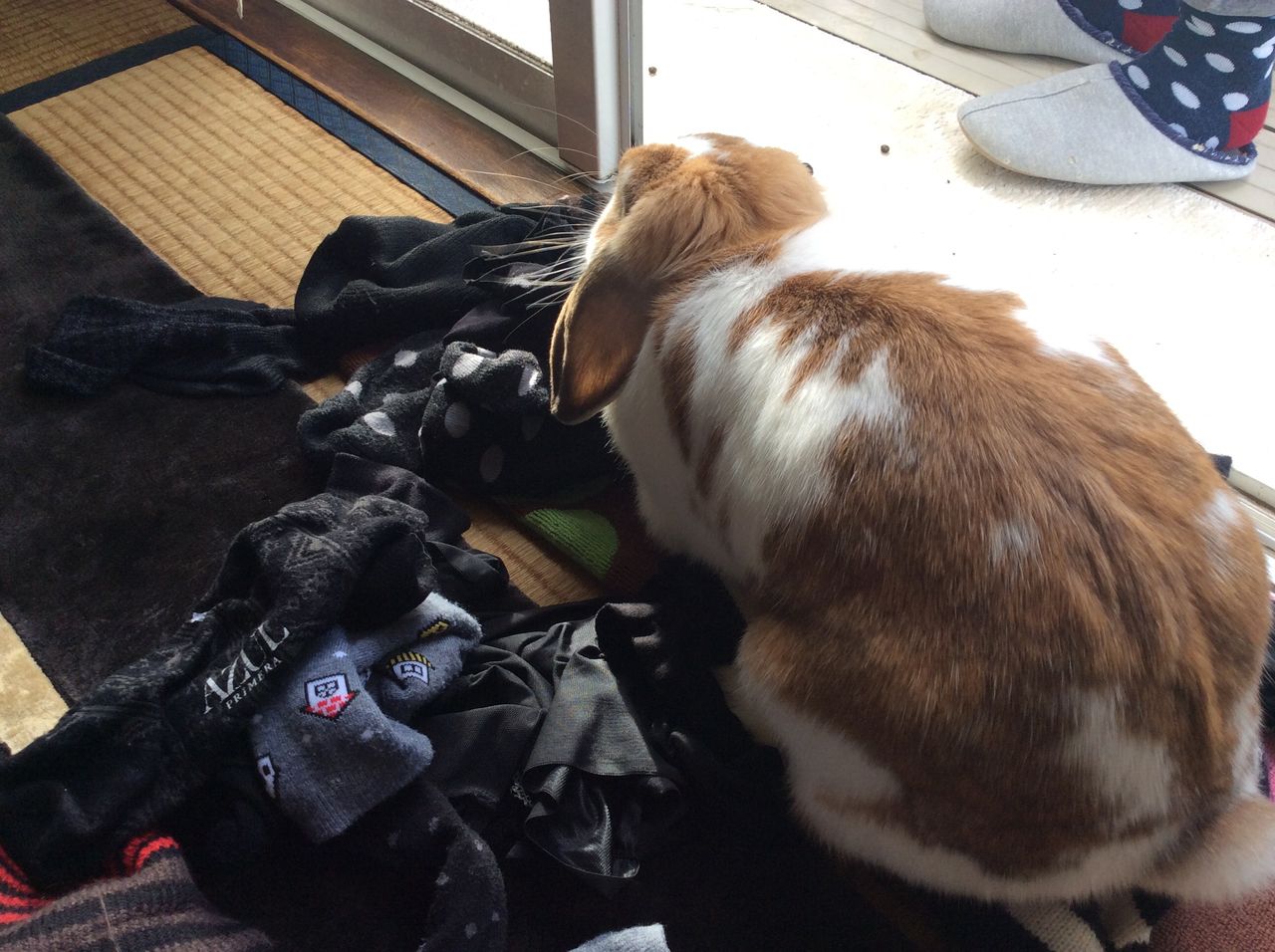 2016年12月29日 大掃除 大掃除しなきゃだよ! まず 洗濯を干すよ~ 「 はーい (ホリホリハムハム) 」 くわえてポイっとやります 床に敷き詰めたカーペットも 50枚位 洗いました ( シッコらしき物があちこちに・・) 「 とりゃぁ~ すべる床もへっちゃら 」 見てて怖いくらい滑る床も全速力で 走りまわるのです 「 ちょっとご飯タイム❗️ 」 ずぅーとついて来ては 自分も 手伝っている気になってるのです 床拭きが笑えるのです 必ず ウンを落としながらついて来ます ( 本気の掃除だったので写真撮る余裕もなく) 「 疲れたぁ~ 限界 」 + 遊び疲れでは? 👈クリック応援👈