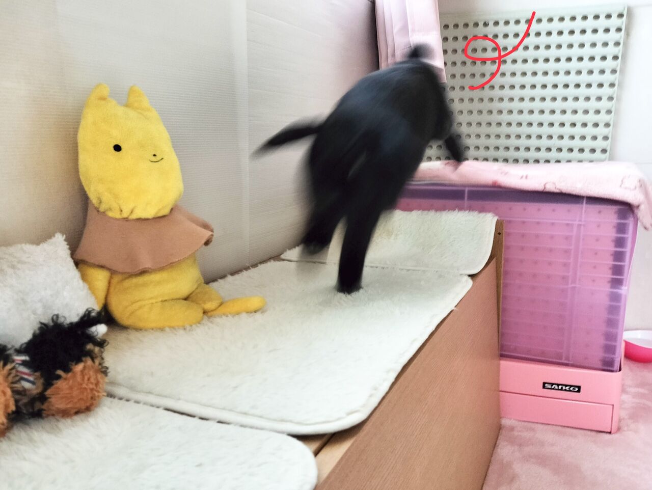 敷物も蹴散らかされ